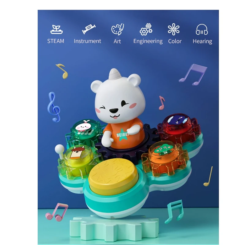 در قسمت جلویی یک کلید زرد رنگ بزرگ قرار دارد که کودک با فشار دادن آن میتواند چراغها را فعال کرده و موسیقی پخش کند. در مرکز این محصول، یک عروسک خرسی بامزه روی چرخدندهها قرار دارد که یک چراغ نیز روی سر آن تعبیه شده است؛ با روشن شدن اسباببازی، این چراغ نیز شروع به نوردهی میکند.