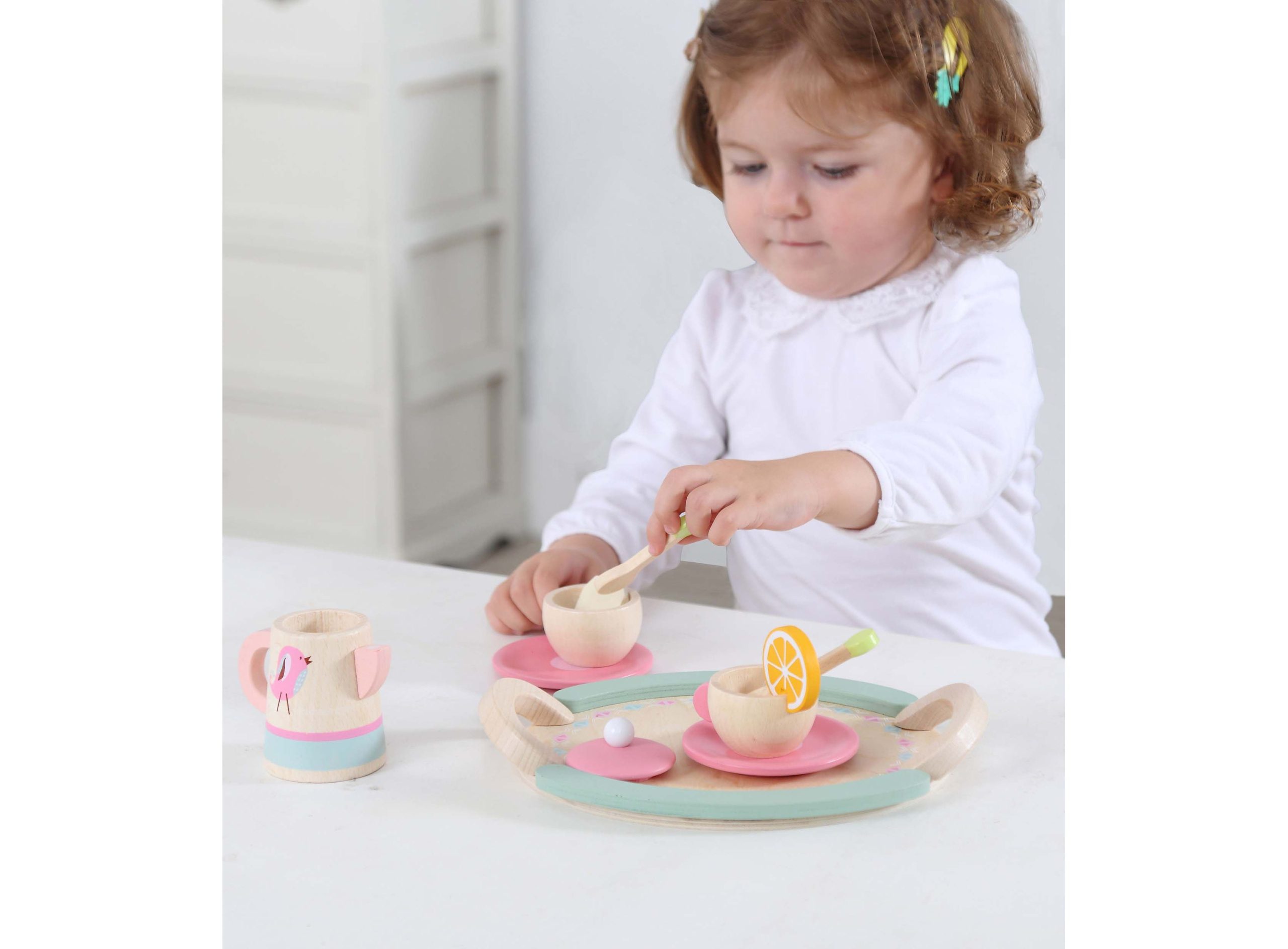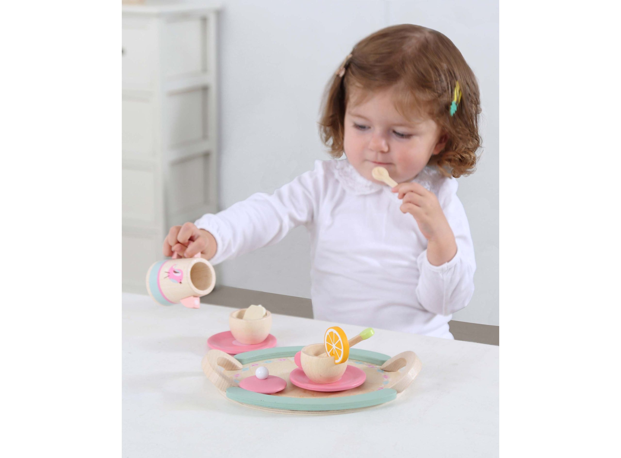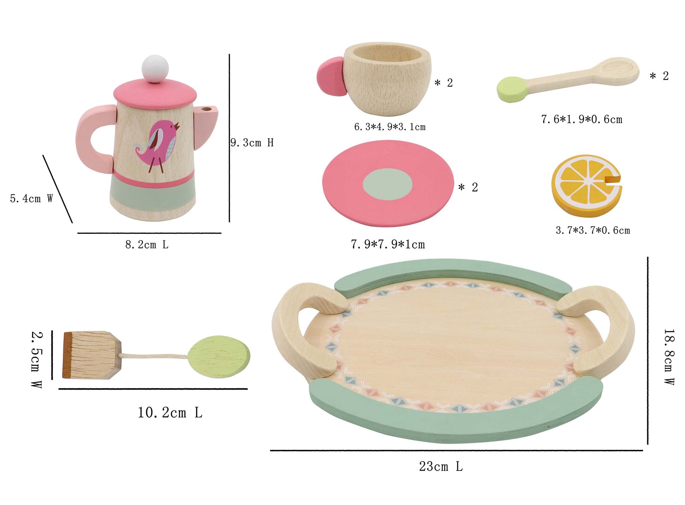 اسباب بازی ست چای خوری چوبی هدیهای بینظیر برای کودکان بالای 3 سال است. این اسباب بازی یک ست منحصربهفرد برای نقش بازی کودکان است و به گفتن و سراییدن داستانهای فانتزی توسط کودک کمک میکند. جنس این محصول از چوب مرغوب است که دارای لبههای گرد است تا آسیبی به کودک وارد نکند و همچنین رنگ به کار رفته که بر پایه آب و غیر سمی است.