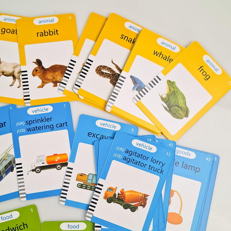 • 112 عدد فلش کارت دو رو جهت آموزش زبان انگلیسی و لغات اولیه به کودکان با موضوعات نیازهای روزانه، حیوانات، وسایل نقلیه، غذا، میوه و…