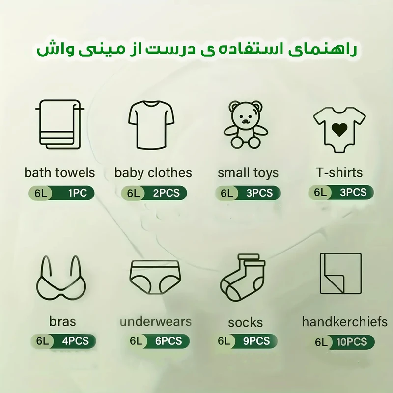 ✅ ظرفیت مناسب: ۶ لیتر حجم شستوشو، مناسب برای لباسهای کمحجم مثل لباس نوزاد یا لباسهای روزمره.